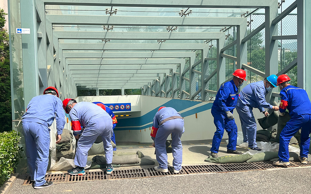“收到,目前正安排各应急救援小组人员赶赴现场,设置警戒线、检查雨水井是否堵塞、启动集水池排水泵、地库入口码放沙袋......”这是京西热电防汛应急演练场景,演练人员手持沙袋,快速向事故现场集结。