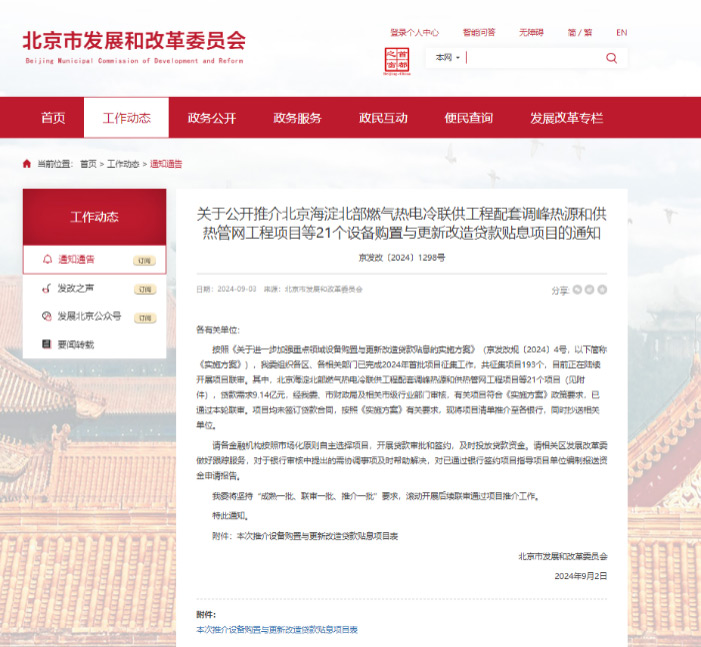 9月2日,北京市发改委印发《北京市发展和改革委员会关于公开推介北京海淀北部燃气热电冷联供工程配套调峰热源和供热管网工程项目等21个设备购置与更新改造贷款贴息项目的通知》(京发改〔2024〕1298号),公司申报的北京海淀北部燃气热电冷联供工程配套调峰热源和供热管网工程项目等三个项目位列其中。本次申报预计两年期共收到300万-700万元项目贴息资金,将有效助力公司效益提升。