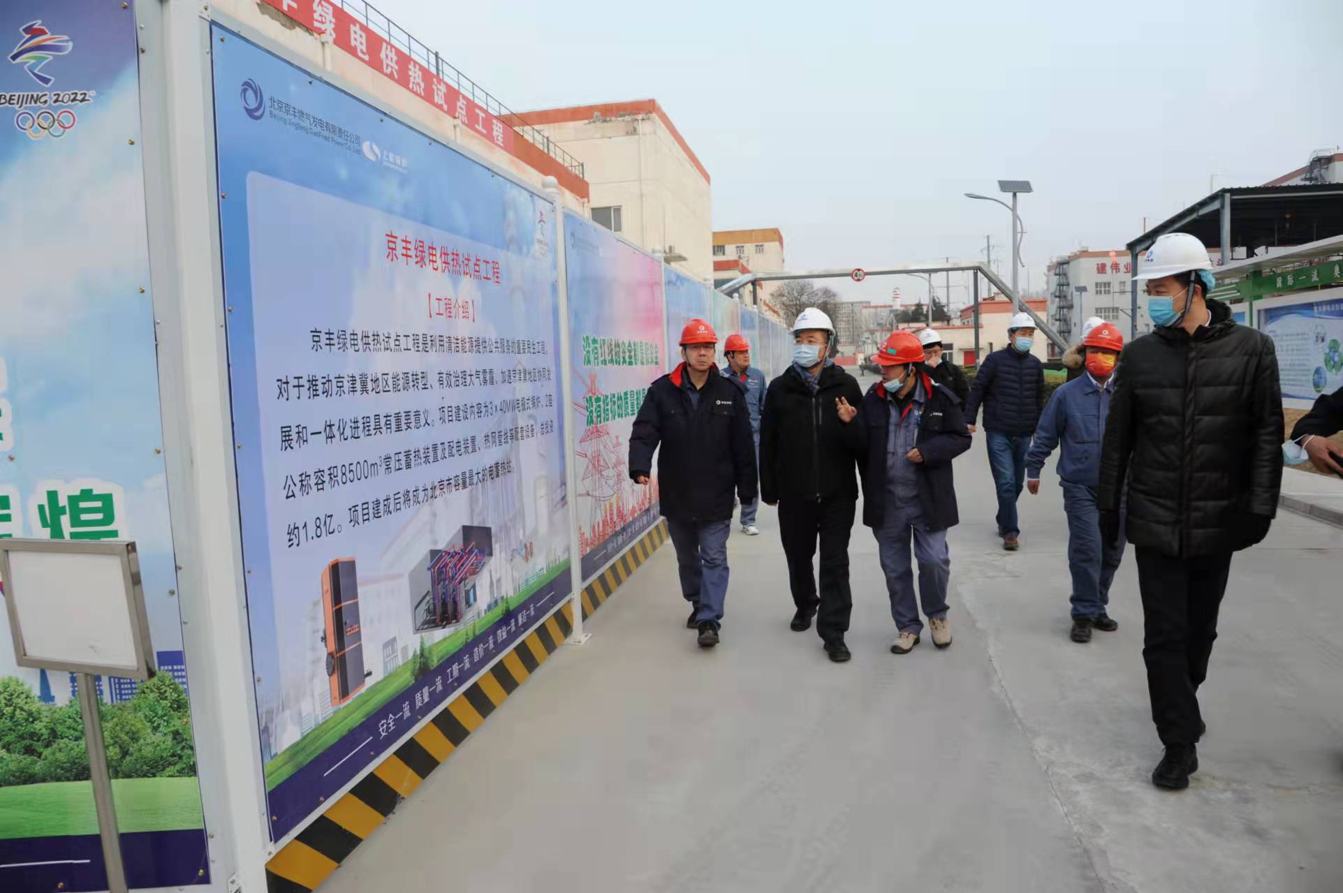 2022年1月5日,集团党委常委、副总经理王永亮,副总经理隋晓峰等一行到京丰燃气视察京丰绿电供热试点工程施工现场并组织召开京丰绿电供热试点工程调研协调会。京丰燃气就生产经营、党建工作、“十四五”发展思路等方面做了简要汇报,并对京丰绿电工程项目完成进度、难点问题进行了专题汇报。王永亮对工程的总体进展与现场施工状态给予肯定并提出了具体要求:一是京丰绿电供热试点工程项目要坚定不移地以“保安全、保投产、保金奖”为目标,抓住窗口期,完成各节点任务目标。二是京丰燃气要紧跟能源行业改革形势,努力实现“双碳”目标。三是着力构建以新能源为主体的新型电力系统,树立品牌,妥善规划,打造团队,构建区域能源服务中心。