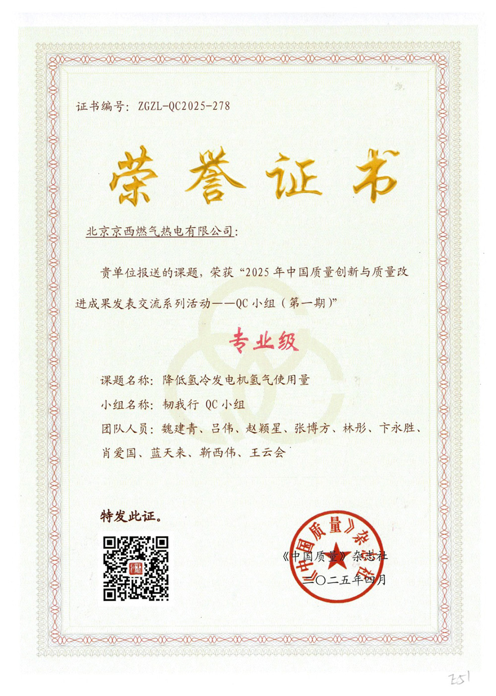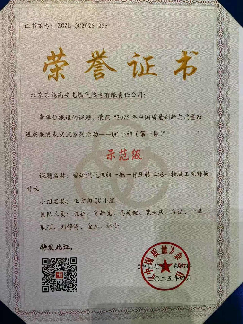 近日,在2025年中国质量创新与质量改进成果发布交流系列活动——QC小组(第一期)中,高安屯热电正方向QC小组“缩短燃气机组‘一拖一’背压转‘二拖一’抽凝工况转换时长”创新成果,斩获“示范级”奖项,为京能集团首次摘得该领域最高荣誉;京西热电“韧”我行QC小组“降低氢冷发电机氢气使用量”创新成果,同样在近600个课题中脱颖而出,斩获“专业级”奖项。
